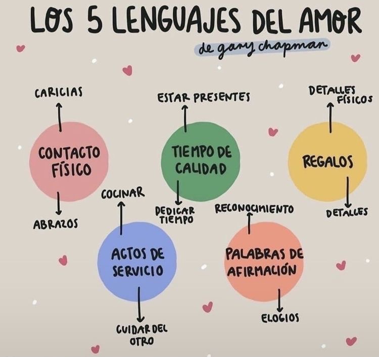 Aprendí que los 5 lenguajes del amor son: 1) El tiempo de calidad, 2) Las palabras de afirmación, 3) Los regalos, 4) Los actos de servicio; y, por último, 5) El contacto físico.